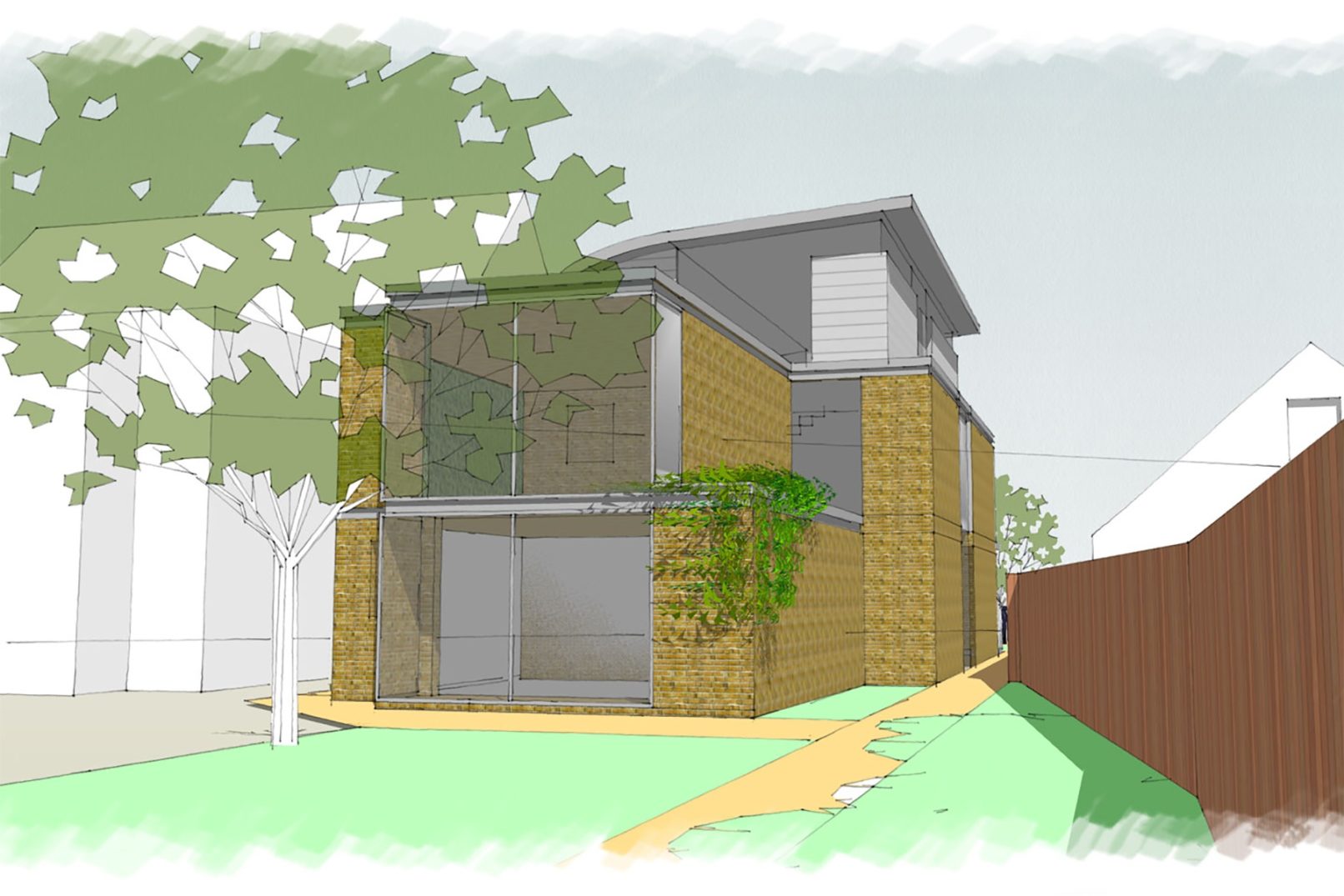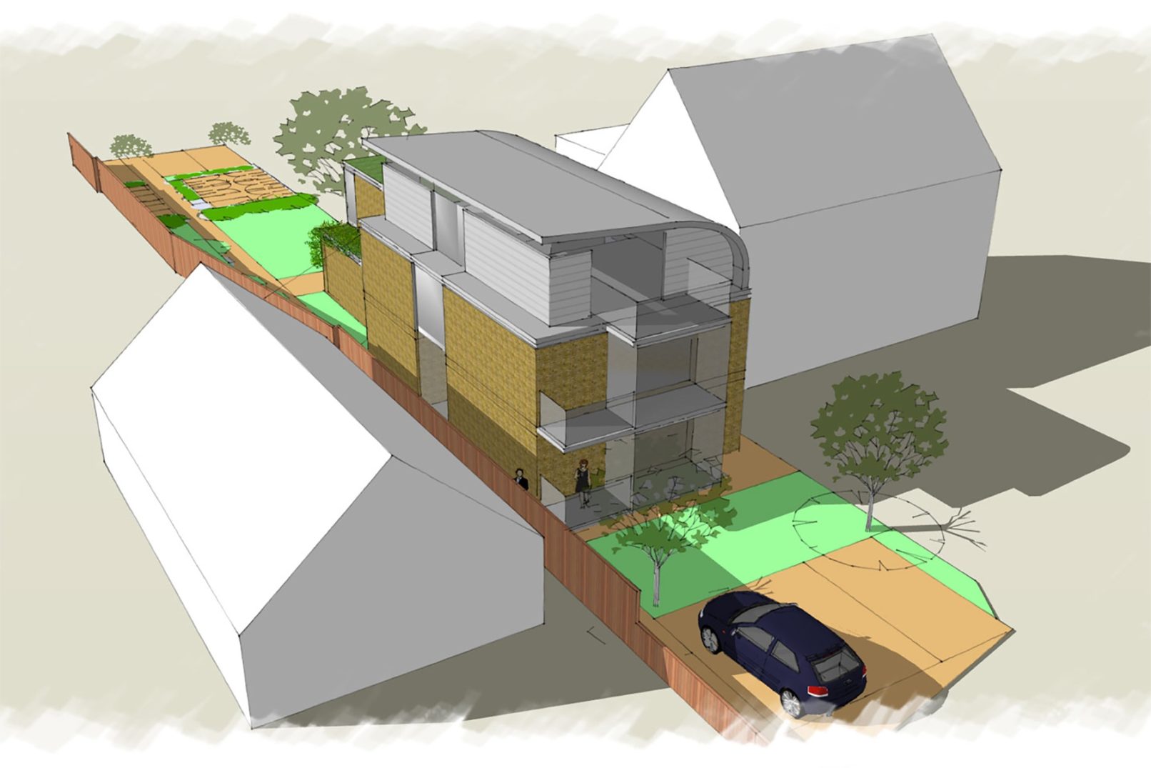 This new flats project was as sketch scheme for pre-application discussions for a development to replace an existing 2 storey pitched roof dwellings with up to 5 x 1 and two bed flats.