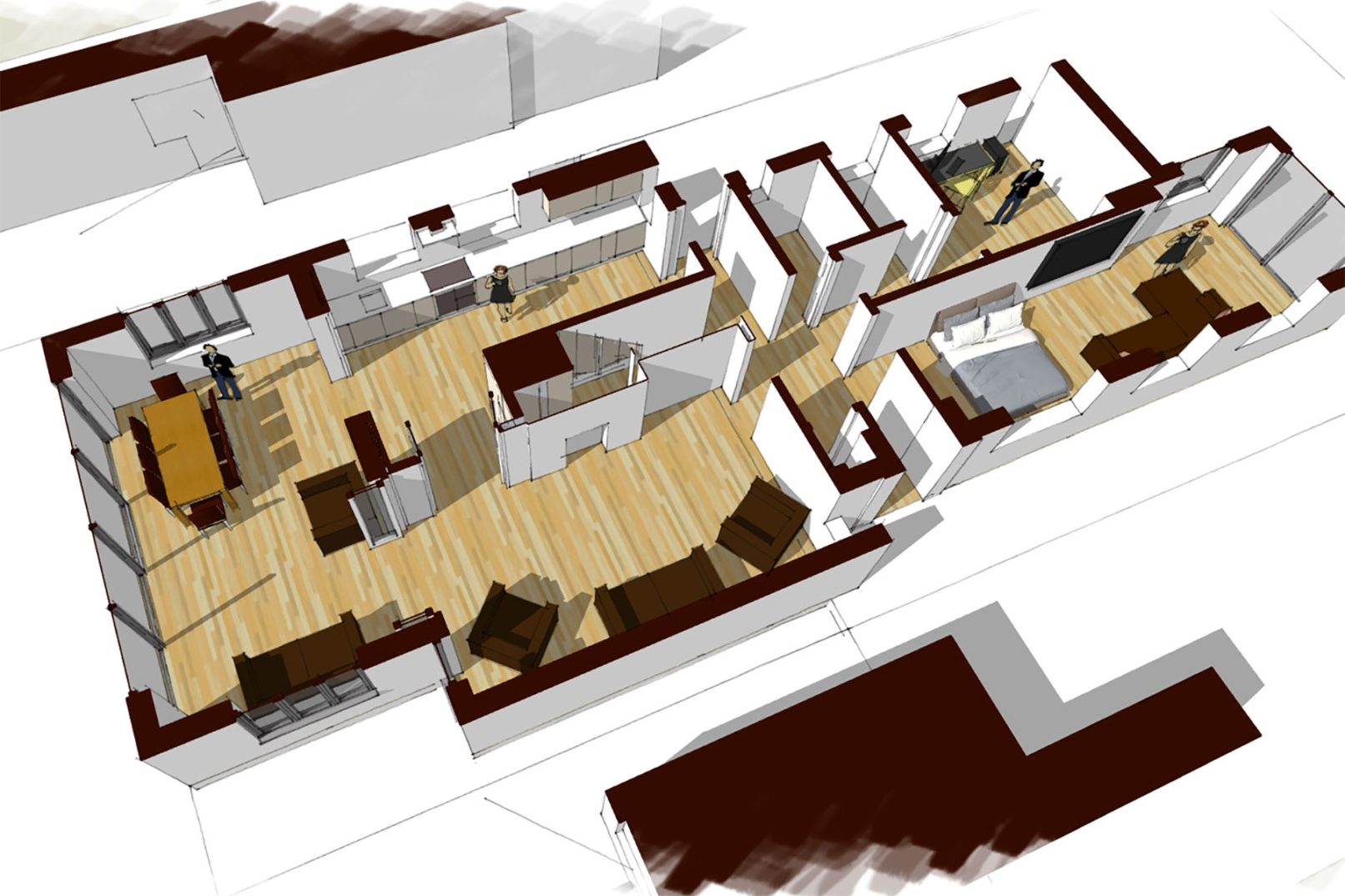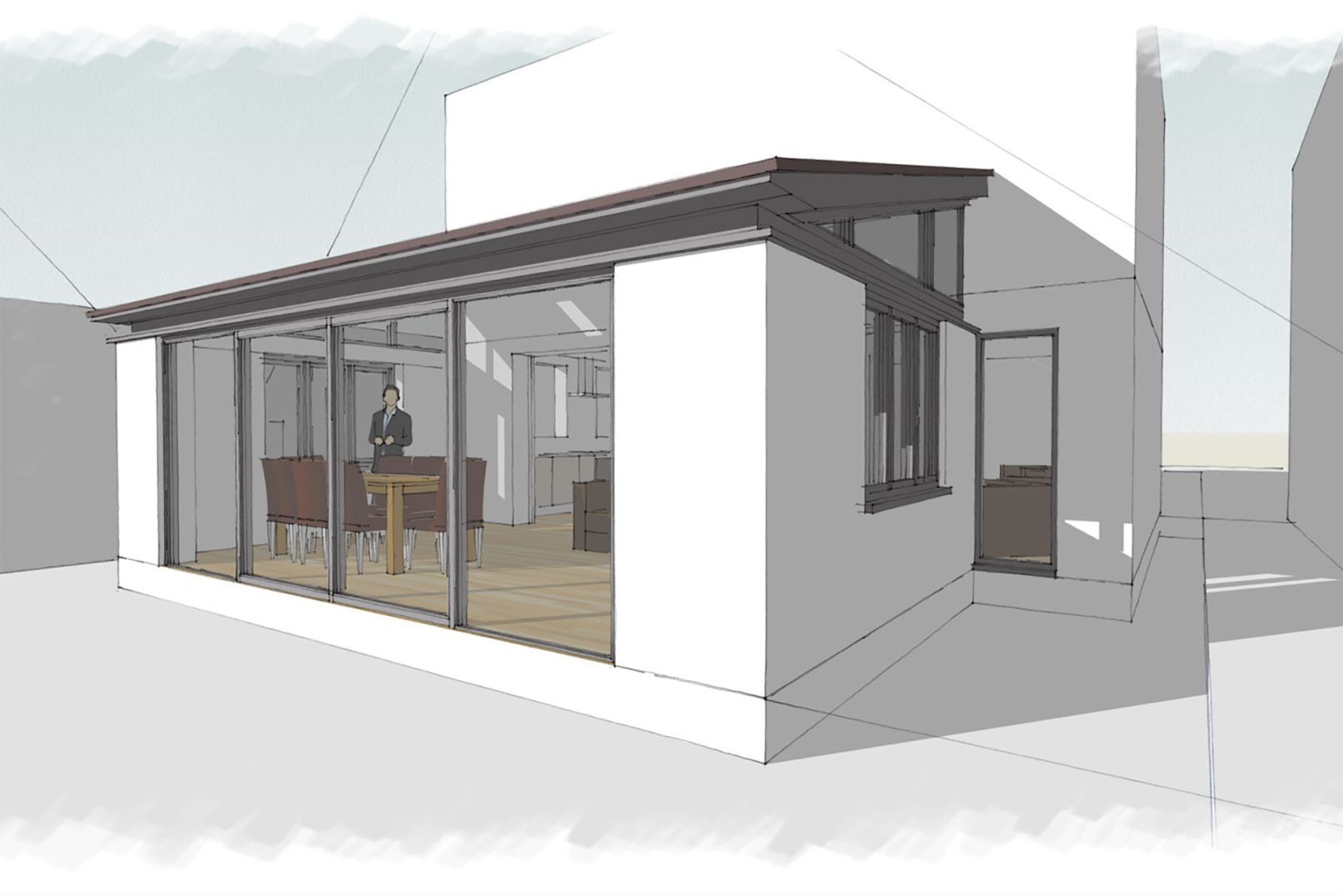 A new front and rear extension was needed to replace an existing conservatory with a year-round use garden room. The challenge was that the ‘rear’ was actually the front of the house, facing a main road. The design plan is to open up the living room and kitchen to the garden, bringing in lots of light.
